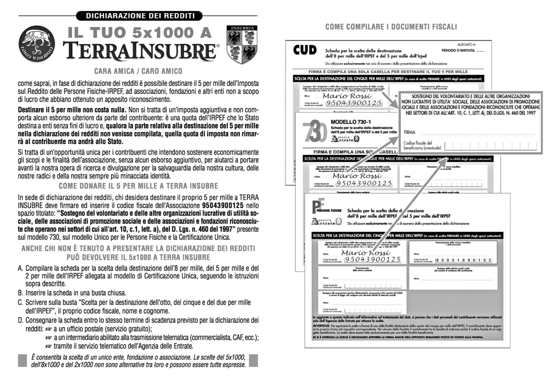 In sede di dichiarazione dei redditi, chi desidera destinare il proprio 5 per mille a TERRA INSUBRE deve firmare ed inserire il codice fiscale dell’Associazione: 95043900125