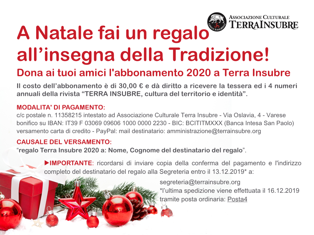 A NATALE REGALA L’ISCRIZIONE 2020 A TERRA INSUBRE A Natale regala l’iscrizione annuale 2020 a Terra Insubre. Per info: segreteria@terrainsubre.org By usr_ADM| 2019-12-01T22:43:11+00:00 dicembre 1st, 2019|Insubria News, Rivista Terra Insubre|0 Comments Share This Story, Choose Your Platform! FacebookTwitterLinkedinRedditTumblrGoogle+PinterestVkEmail About the Author: usr_ADM Related Posts Nuova edizione “Piante selatiche d’Insubria in alimentazione e in medicina” Gallery Nuova edizione “Piante selatiche d’Insubria in alimentazione e in medicina” aprile 19th, 2026 | 0 Comments Pubblicata la rivista “Terra Insubre” n. 114 | 2° semestre 2025 Gallery Pubblicata la rivista “Terra Insubre” n. 114 | 2° semestre 2025 marzo 8th, 2026 Aperto il tesseramento 2026 a Terra Insubre. Gallery Aperto il tesseramento 2026 a Terra Insubre. gennaio 30th, 2026 Rendiconto 5×1000 | 2023 Gallery Rendiconto 5×1000 | 2023 gennaio 21st, 2026 Leggende delle Alpi Lepontine | 18 Dicembre Gallery Leggende delle Alpi Lepontine | 18 Dicembre dicembre 10th, 2025 Leave A Comment Annulla risposta Comment